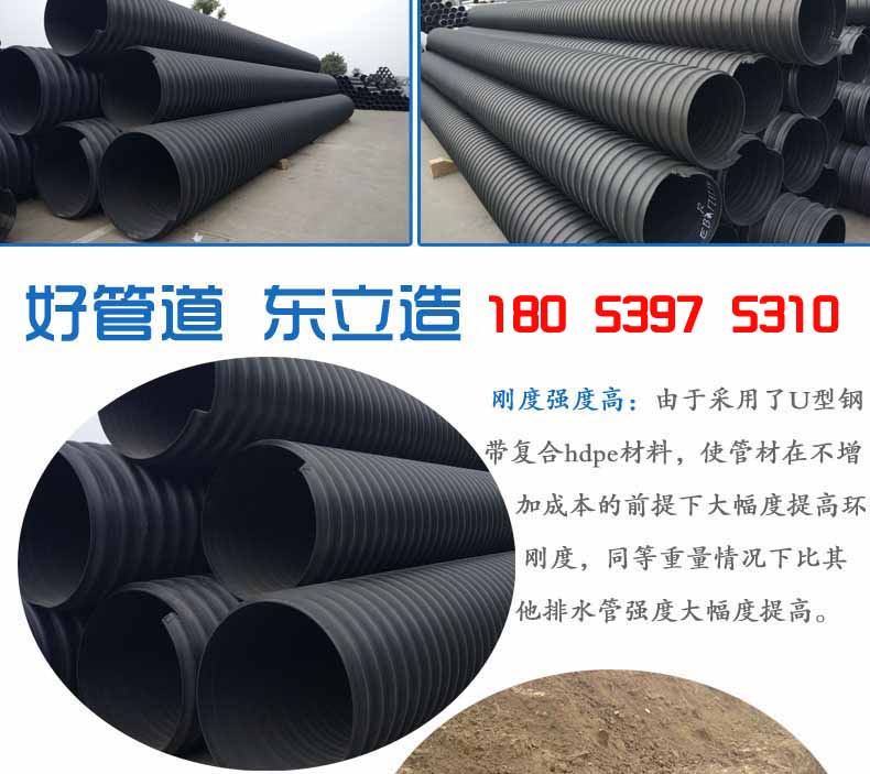 2.大口徑高強(qiáng)度:由于采用了U型鋼帶復(fù)合PE材料,使管材在不增加成本的前提下大幅度提高環(huán)剛度,同等重量情況下比其他塑料排水管強(qiáng)度大幅度提高??山鉀Q重載等一系列問題,大口徑管材優(yōu)勢更加明顯,比水泥管和其它塑料管重量更輕、強(qiáng)度更高。